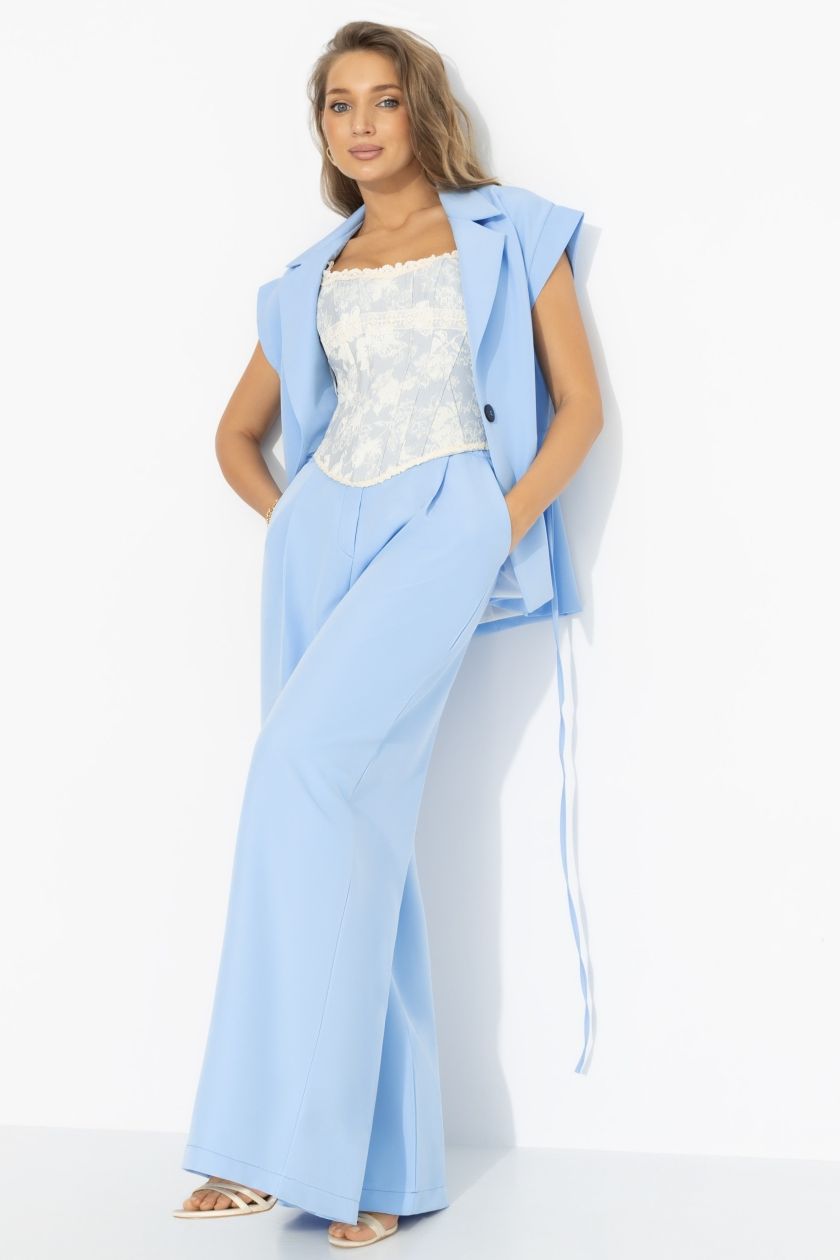 Брюки-палаццо с карманами в голубом цвете от компании Charutti. Модель широкого кроя, высокая посадка на талии, выполнена из костюмной ткани "барби". Пояс классический со шлевками, на пуговице и молнии. Идеальный выбор для городских модниц.