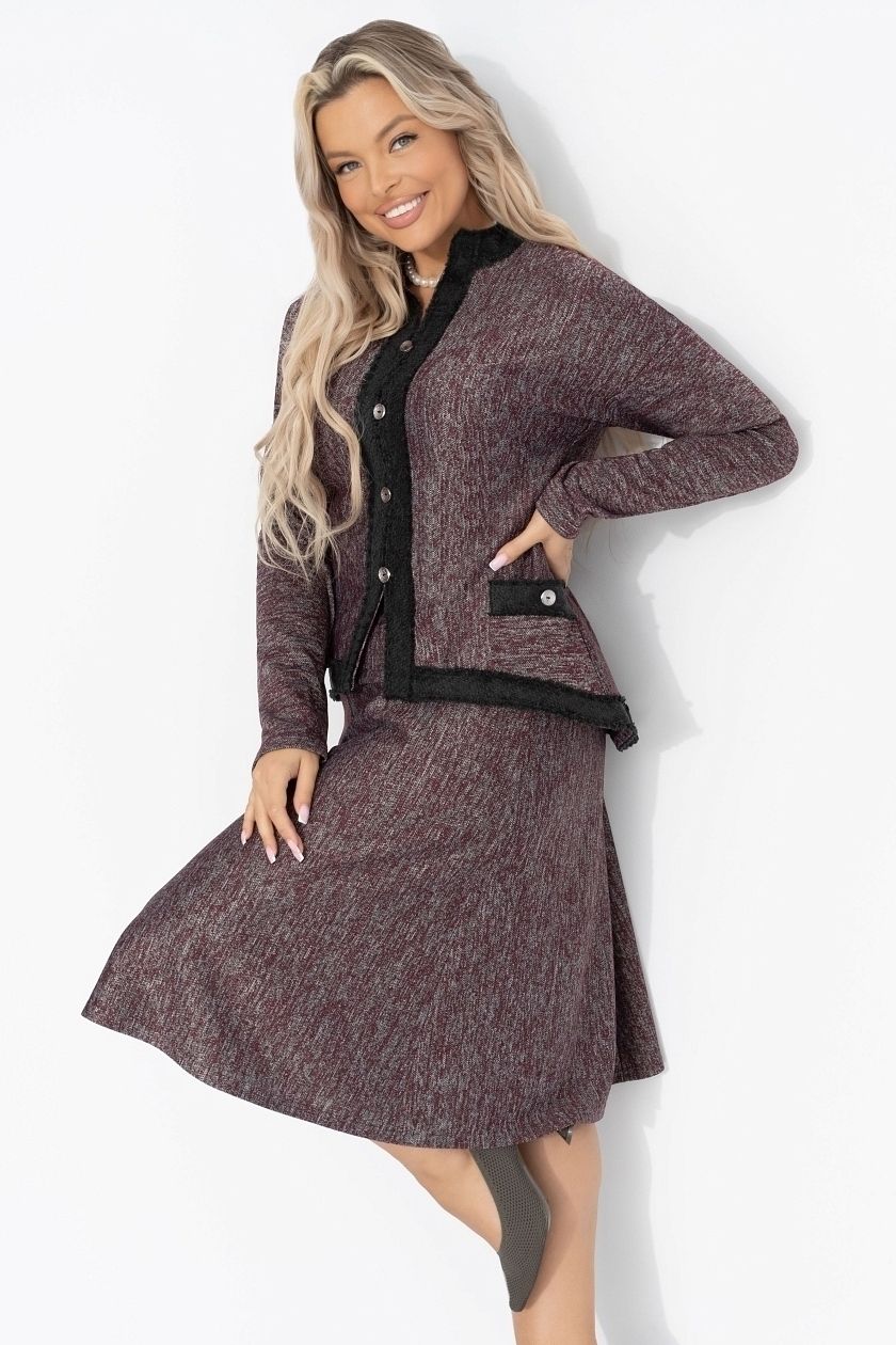 Костюм бордовый с юбкой в стиле Шанель от компании Charutti, выполнен из трикотажа «меланж», «букле шанель». Блуза прямого силуэта с карманами по передней стороне изделия. V-образный вырез горловины, короткие рукава. Пуговицы декоративные. Юбка с клиньями, посадка на талии. Пояс на резинке. Отличный выбор для создания стильного образа.