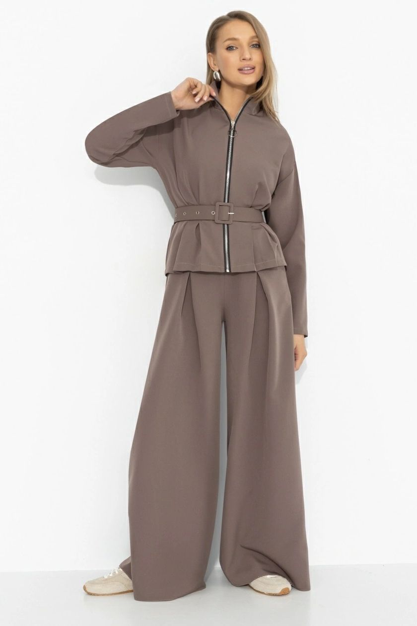 Костюм брючный коричневый спорт-шик от производителя Charutti. Брюки широкие, пояс на резинке, в боковых швах карманы. Жакет с застёжкой на молнию, длинные рукава. Стильный вариант для создания повседневного образа.