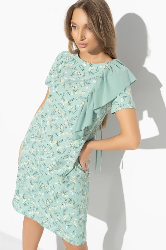 Платье с объёмным воланом от компании Charutti. Модель прямого силуэта, выполнена из плательного полотна с цветочным принтом. Круглый вырез горловины по переду, по спинке V-образный с завязками. Втачные короткие рукава. Идеальный выбор для Вашего стильного гардероба.