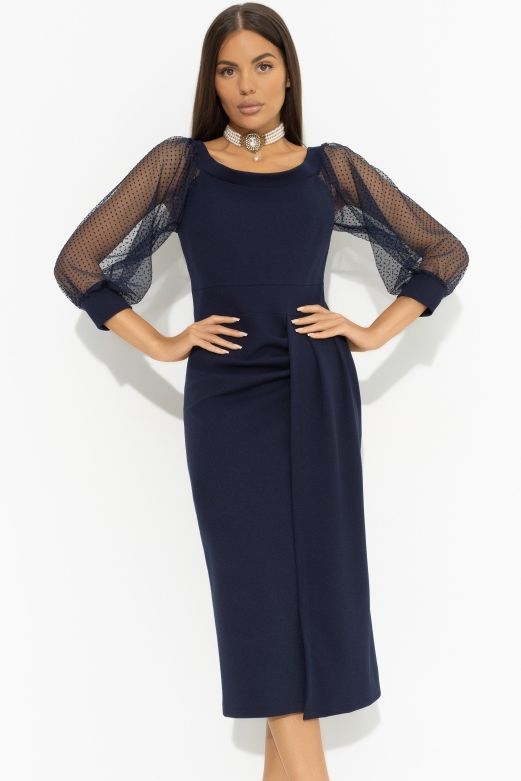 Платье трикотажное синее с высоким разрезом на запах