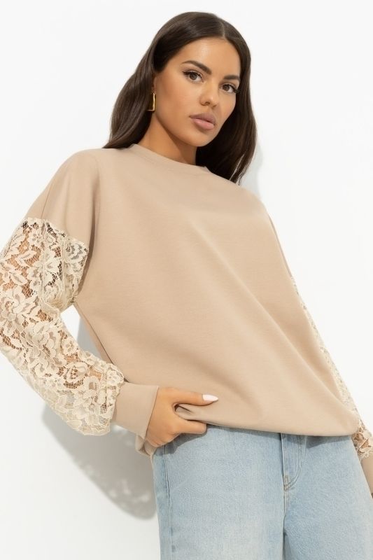 Свитшот комбинированный бежевый с кружевом от компании Charutti. Модель прямого кроя, выполнена из трикотажного полотна "джерси". Круглый вырез горловины. Рукава длинные, линия плеча спущена. Идеальный выбор для Вашего повседневного гардероба.