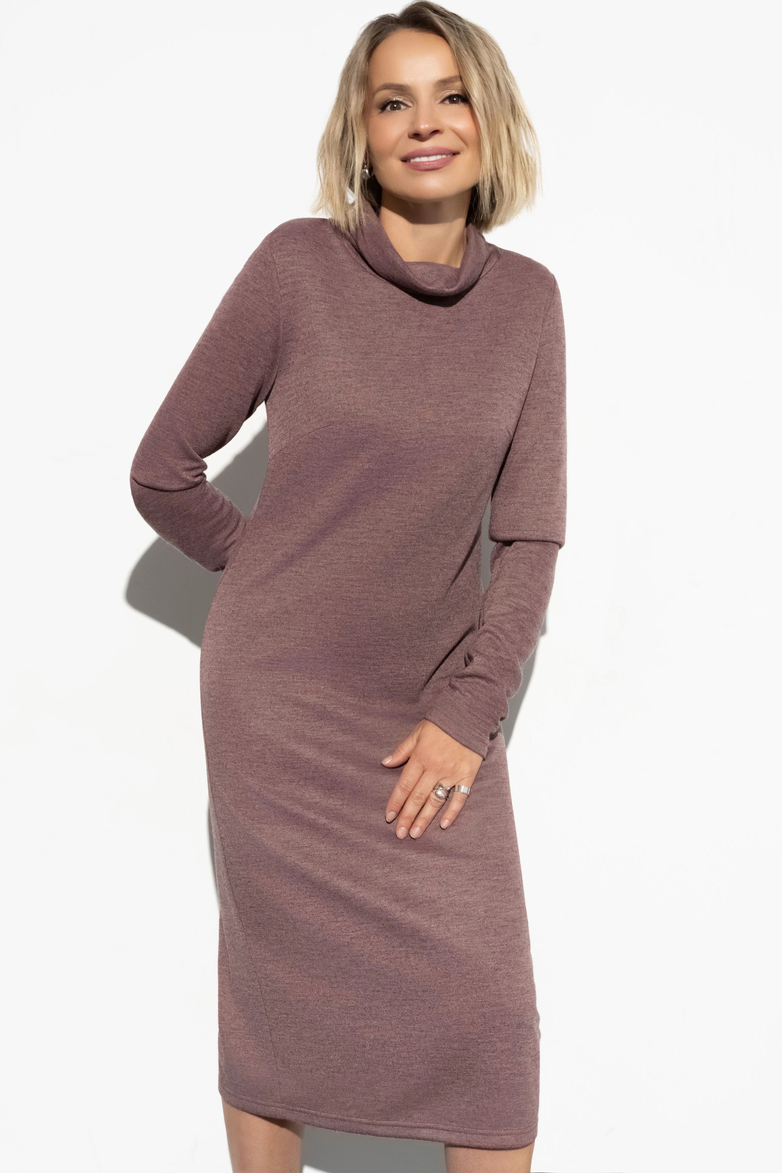 Трикотажное платье с длинными рукавами от компании Charutti. Модель прямого силуэта, выполнена из ткани "меланж" в розовом цвете. Воротник-стойка. Втачные рукава. Низ ровный, по спинке разрез. Идеальный выбор на каждый день.
