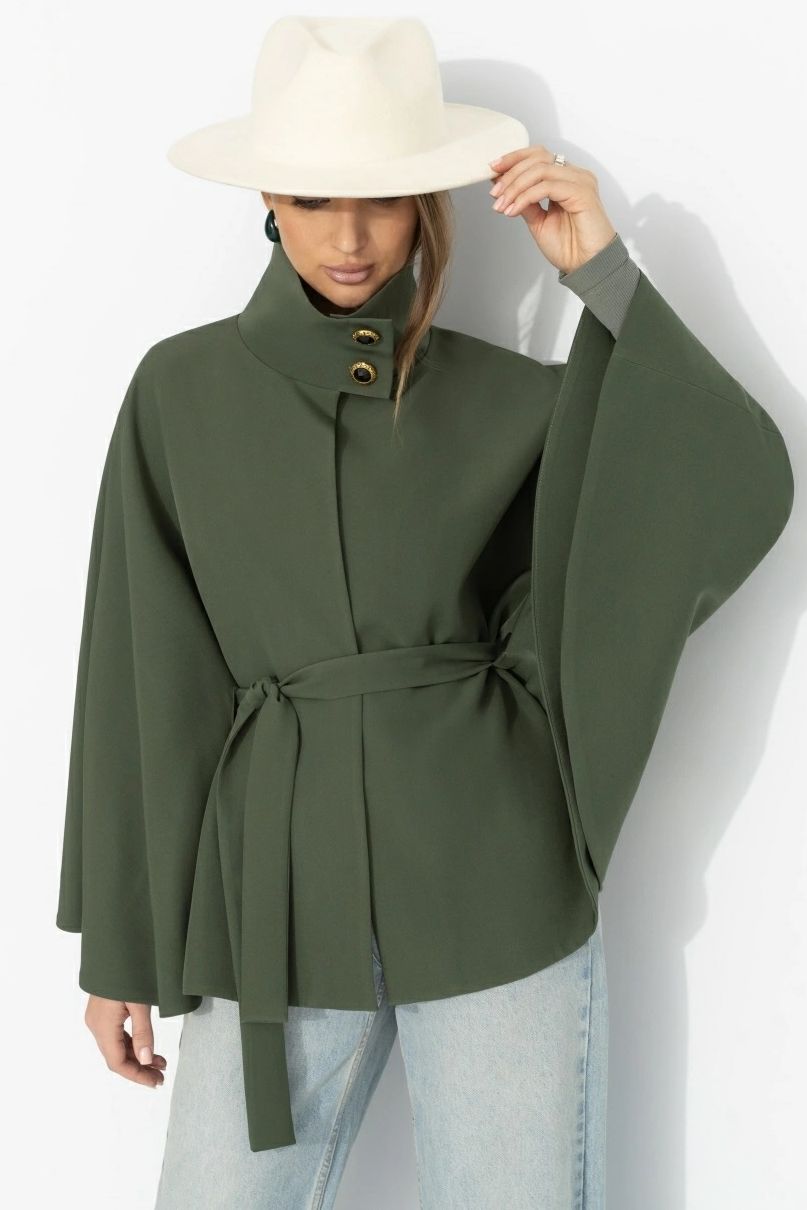 Жакет‑кейп с поясом в цвете хаки от компании Charutti, выполнен из костюмного полотна. Модель можно носить как верхнюю одежду – вместо лёгкой ветровки, плаща или как накидку в тёплый сезон. Пластичная ткань красиво движется при ходьбе, широкие рукава создают эффект кейпа. Пояс подчёркивает талию или остаётся свободным – под разное настроение. Идеален для города, офиса и вечерних выходов. Изделие с высоким воротником-стойкой, на подкладе.