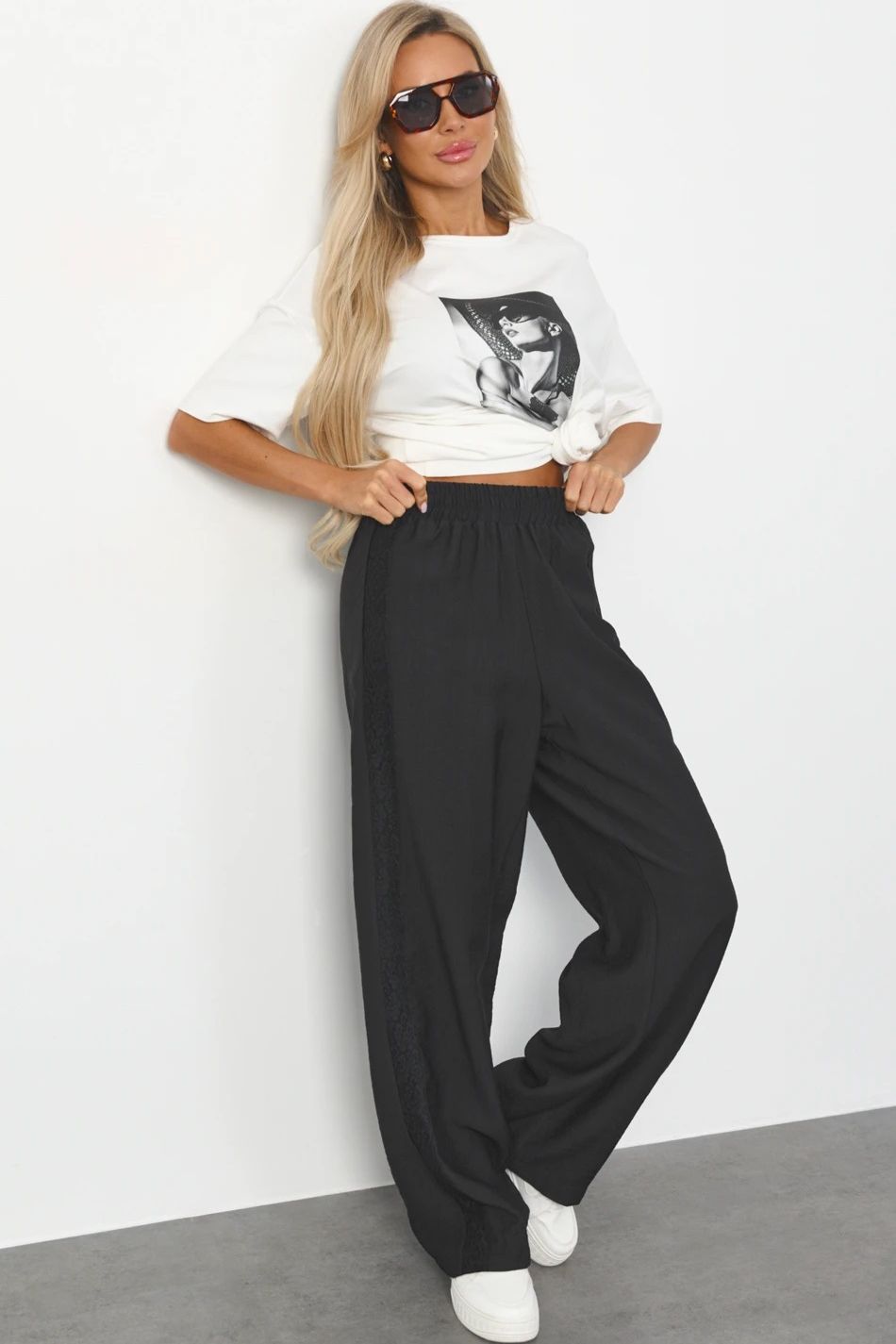 Брюки широкие чёрные от компании Jetty, выполнены из льна. Модель с притчным поясом на резинке. В боковых швах лампас из кружева. Прекрасное решение для создания стильного образа.