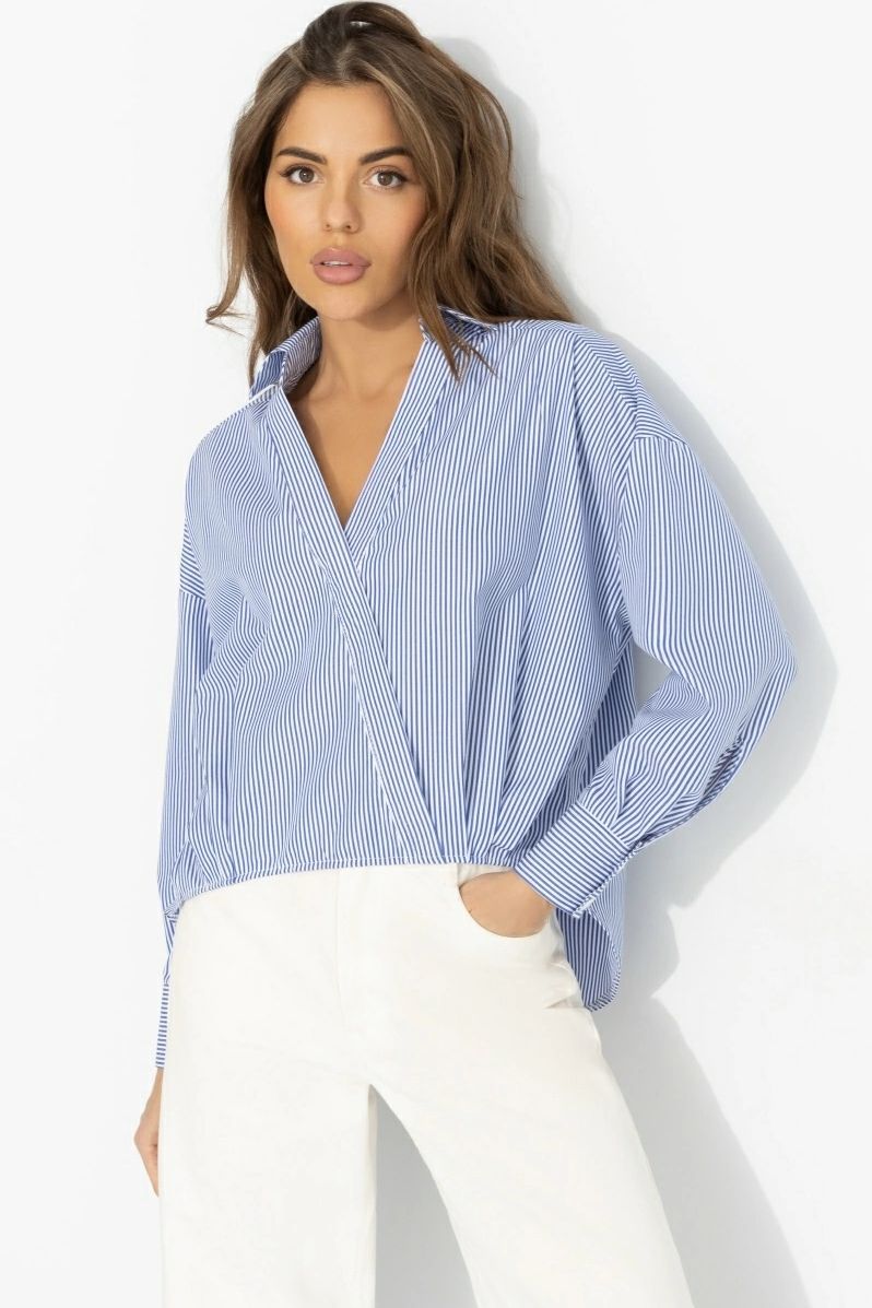 Рубашка женская в полоску от компании Charutti, выполнена из мягкой, воздухопроницаемой ткани. Удлиненный по спинке свободный крой с имитацией запаха позволяет регулировать посадку и корректировать нюансы фигуры. Длинные рукава,V-образный вырез горловины. Для тех, кто любит фантазию в базовом гардеробе.