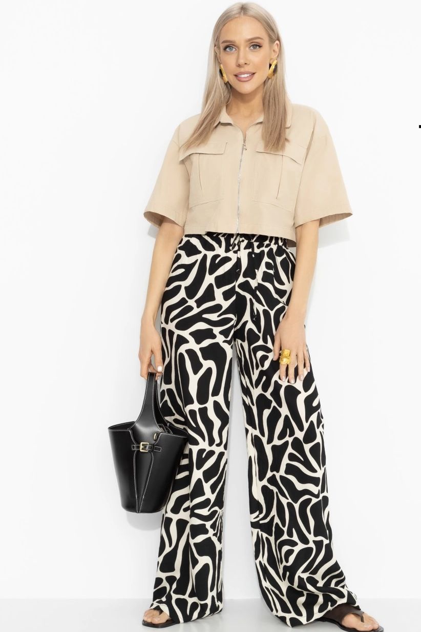 Брюки широкие чёрно-белые от производителя Charutti. Модель свободного кроя, выполнена из вискозной ткани с добавлением нейлона. Высокая посадка и пояс на комфортной резинке. Лёгкий, струящийся материал с выразительным принтом красив при ходьбе и очень приятен на ощупь.