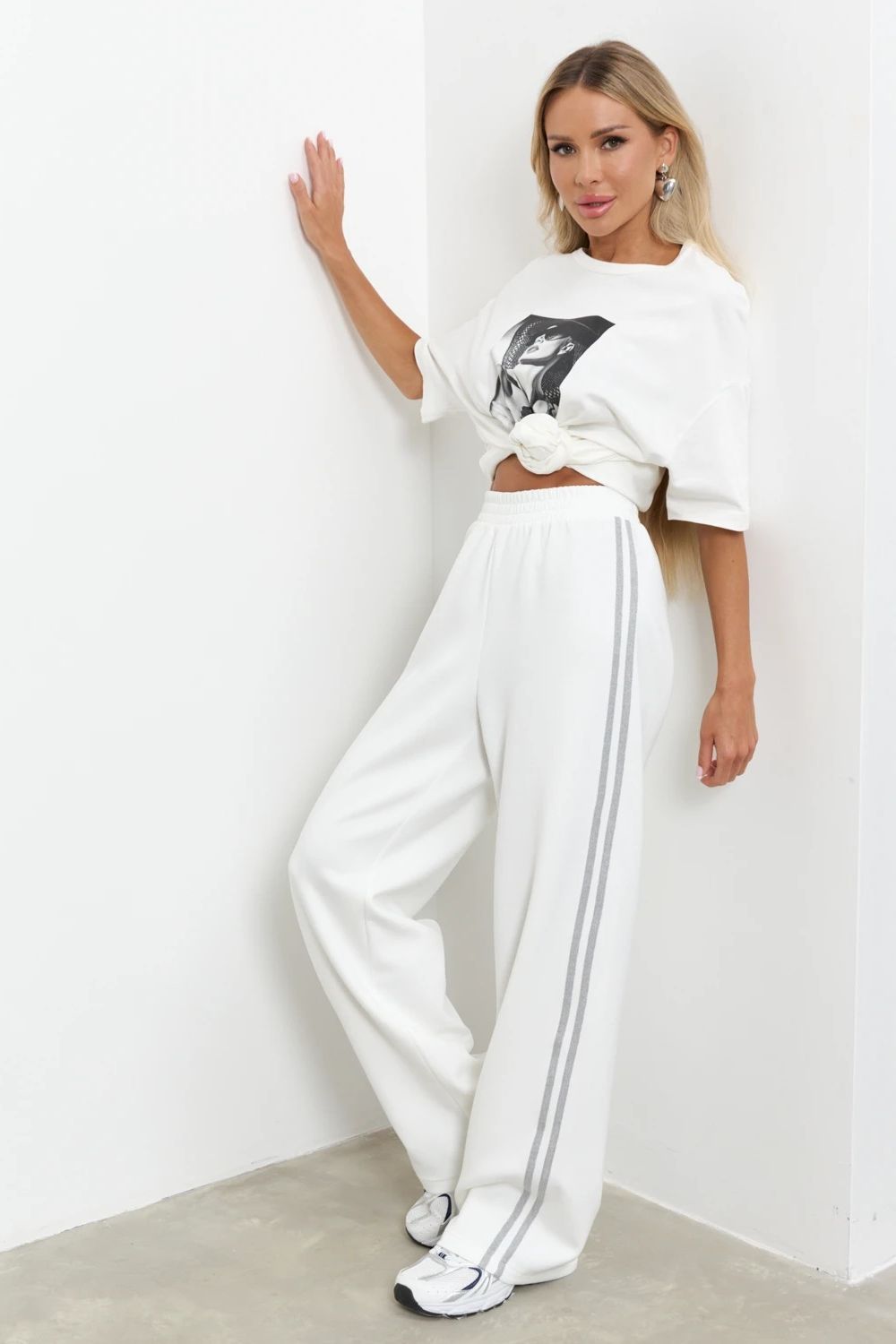 Брюки широкие с лампасами от компании Jetty, выполнена из трикотажа молочного цвета. Притачной пояс-резинка. Прекрасное решение для создания стильного образа.