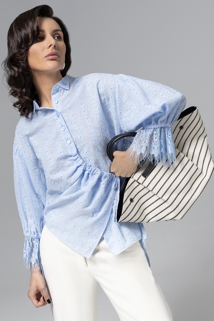 Рубашка голубая с ассиметричной драпировкой и кружевом от компании Charutti. Модель свободного силуэта, выполнена из плательной ткани "Люсан". Длинные рукава. По переду застёжка на пуговицы. Широкие возможности стилизации. Идеальный выбор для создания стильного образа.