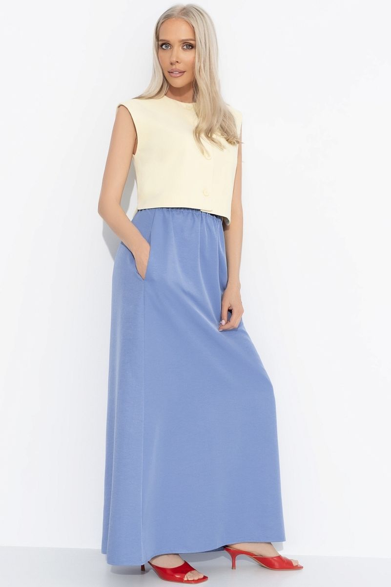 Юбка макси голубая от компании Charutti. Модель расклёшенного силуэта, выполнена из костюмного полотна "гальяно". Юбка с карманами. Пояс на резинке. Есть лейбл бренда на передней части пояса. Идеальный выбор для создания женственного образа.
