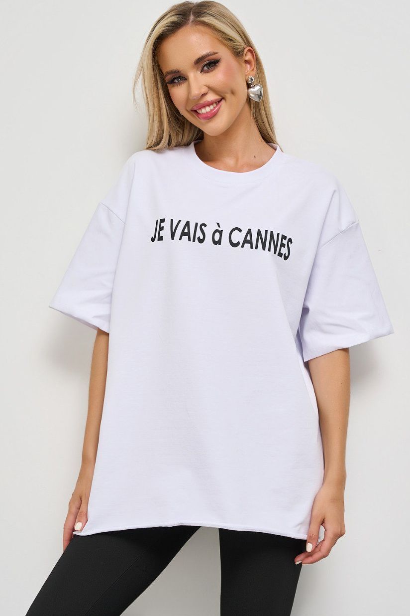 Футболка трикотажная белая с печатным принтом от компании Jetty. Модель свободного силуэта, выполнена из тонкого футера 2-х нитка. Горловина оформлена круглым вырезом. Втачной короткий рукав, со спущенной линией плеча. Низ изделия и рукава с открытым срезом (не обработанный). Пришивной декор со стразами. Идеальный выбор для городских модниц.