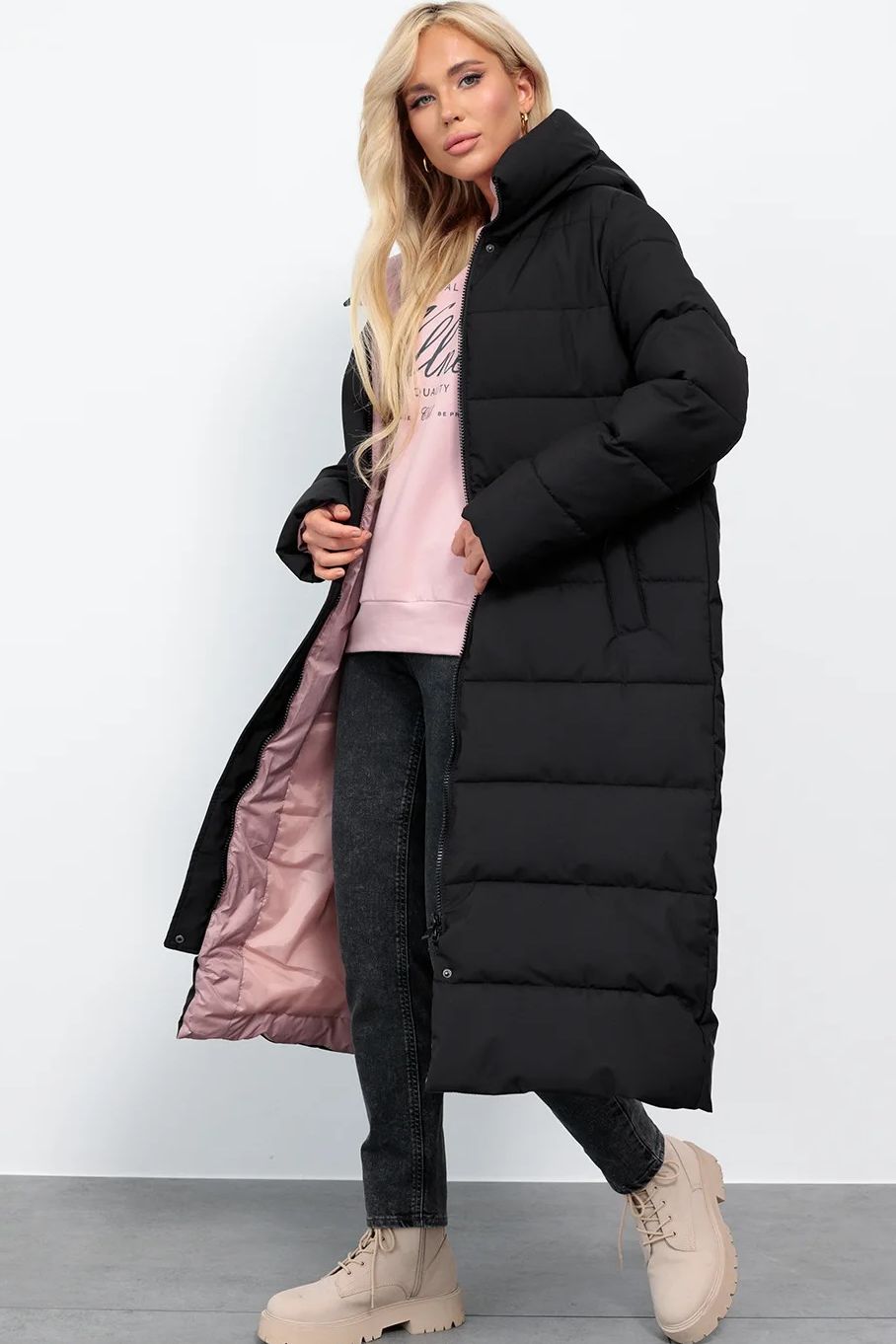 Длинный чёрный пуховик